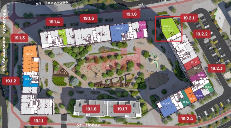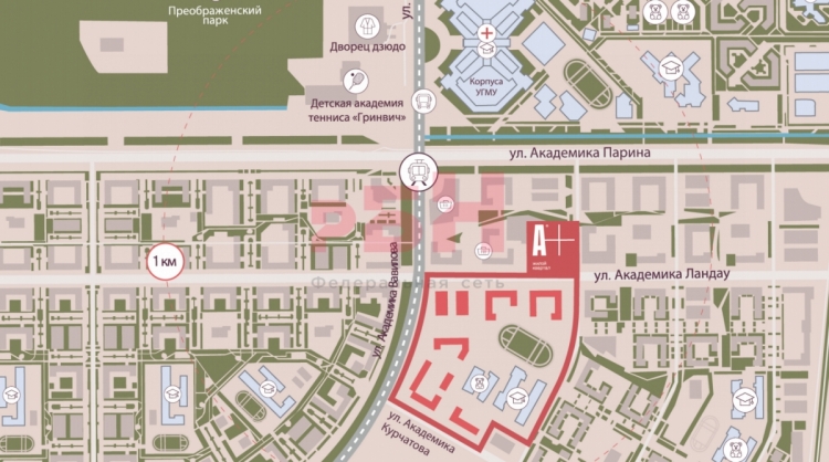 - ЖК А+ расположен в квартале улиц Вавилова-Курчатова-Академика Ландау;