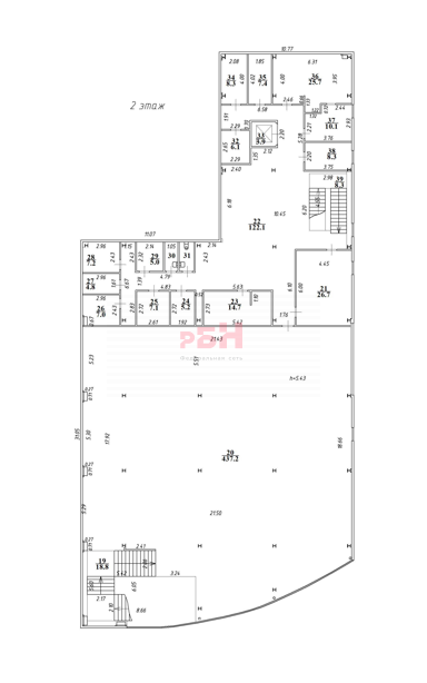 Площадь 2 этажа – 752,9 м2, торговый зал – 625,6 м2. Высота потолков – 4,4 м.